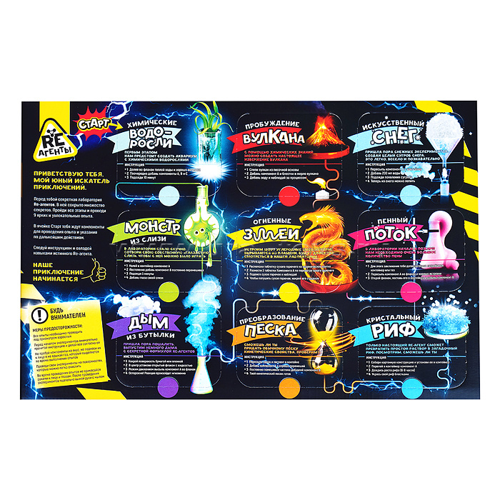Секретная лаборатория хранит в себе множество тайн и загадок. Перед Вами 9 секретных опытов, которые необходимо провести в строго определенном порядке, чтобы лаборатория раскрыла свои секреты. Только истинный re-агент сможет провести все опыты. Сможете ли Вы пройти этот квест? Уникальный игровой процесс, позволяющий провести не только увлекательные эксперименты, но и игровой форме пройти настоящий квест. Этот набор предлагает познакомиться с химическии процессами и изучить свойства разных веществ. Все принадлежности, необходимые для успешной работы, включены в состав набора. В процессе игры дети смогут получить массу положительных эмоций, а также приобрести первые познания в науке и расширить кругозор. Хранить при температуре от +5 до +35 градусов С. Соответствует требованиям безопасности и стандартам качества продукции.