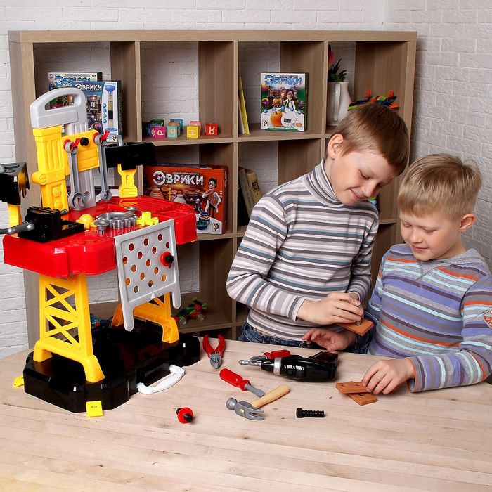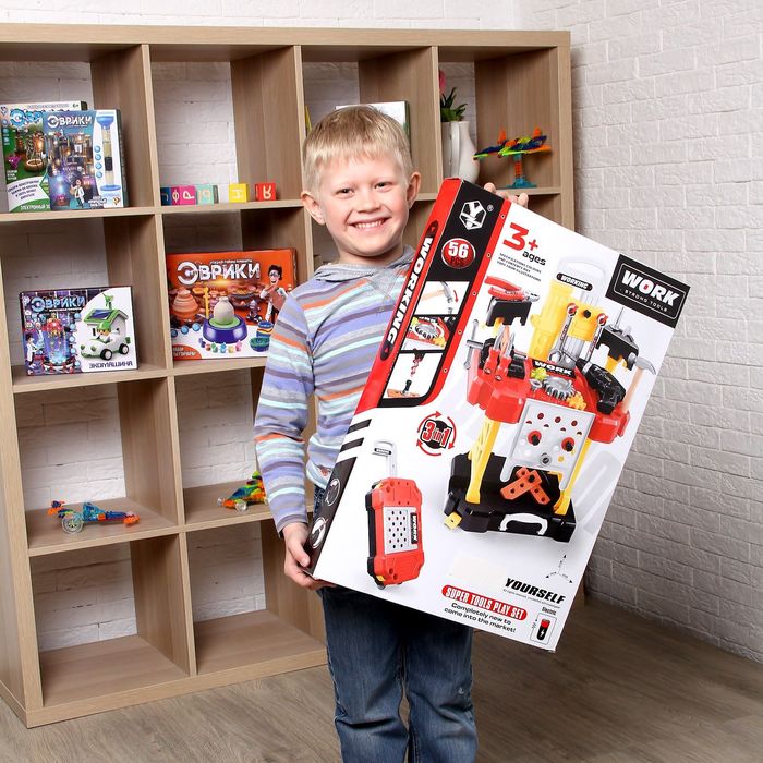 Основной элемент этого набора – верстак с различными принадлежностями. Игра с таким набором прививает очень полезные навыки, которые необходимы каждому мужчине. Особенно интересной игру сделает электродрель, у которой вращается сверло, причём есть переключатель вращения сверла по часовой и против часовой стрелки!