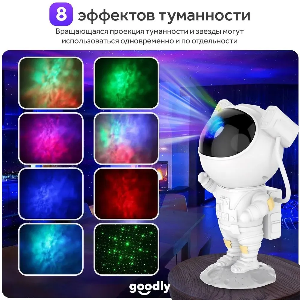 Проекция звездного неба, осуществляемая с помощью лазерного освещения, наполняет вашу комнату ярким светом, превосходящим по мощности светодиодные светильники. Подарите себе незабываемый вечер, включив "Астронавта" на домашней вечеринке или во время просмотра фильмов, применяя его для создания волшебной атмосферы в вашем доме. Также он может служить в качестве ночника для вдохновляющего освещения в течение ночи.