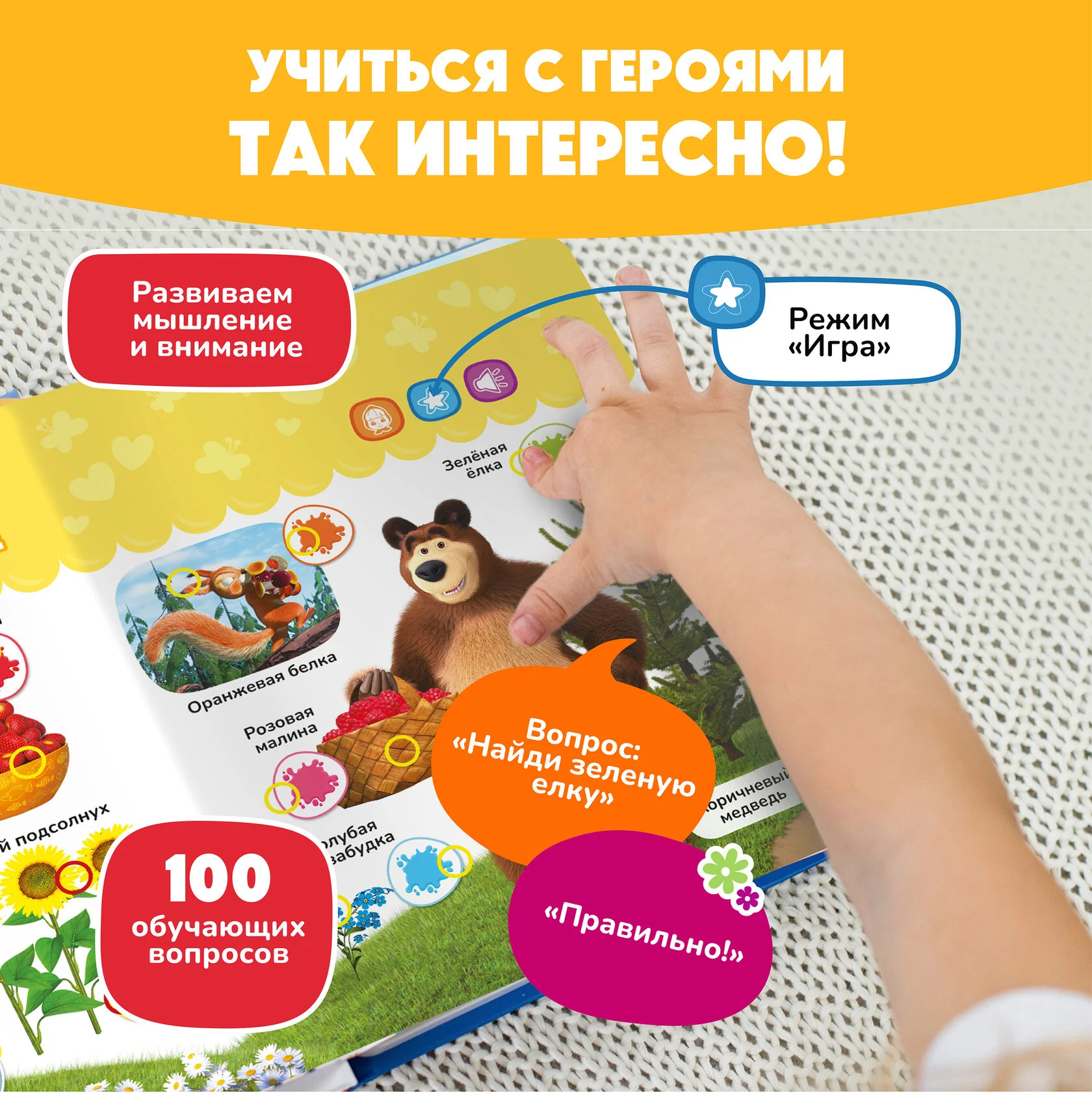 Теперь Маша и Медведь будут радовать вас не только на экране, но и в необычной книжке! Нажимайте пальчиком на страницы и картинки оживут! 22 яркие страницы, отдельная тема на каждом развороте. В книге герои мультфильма говорят своими голосами — более 500 фраз и заданий, которые помогают тренировать память и пополнять словарный запас.