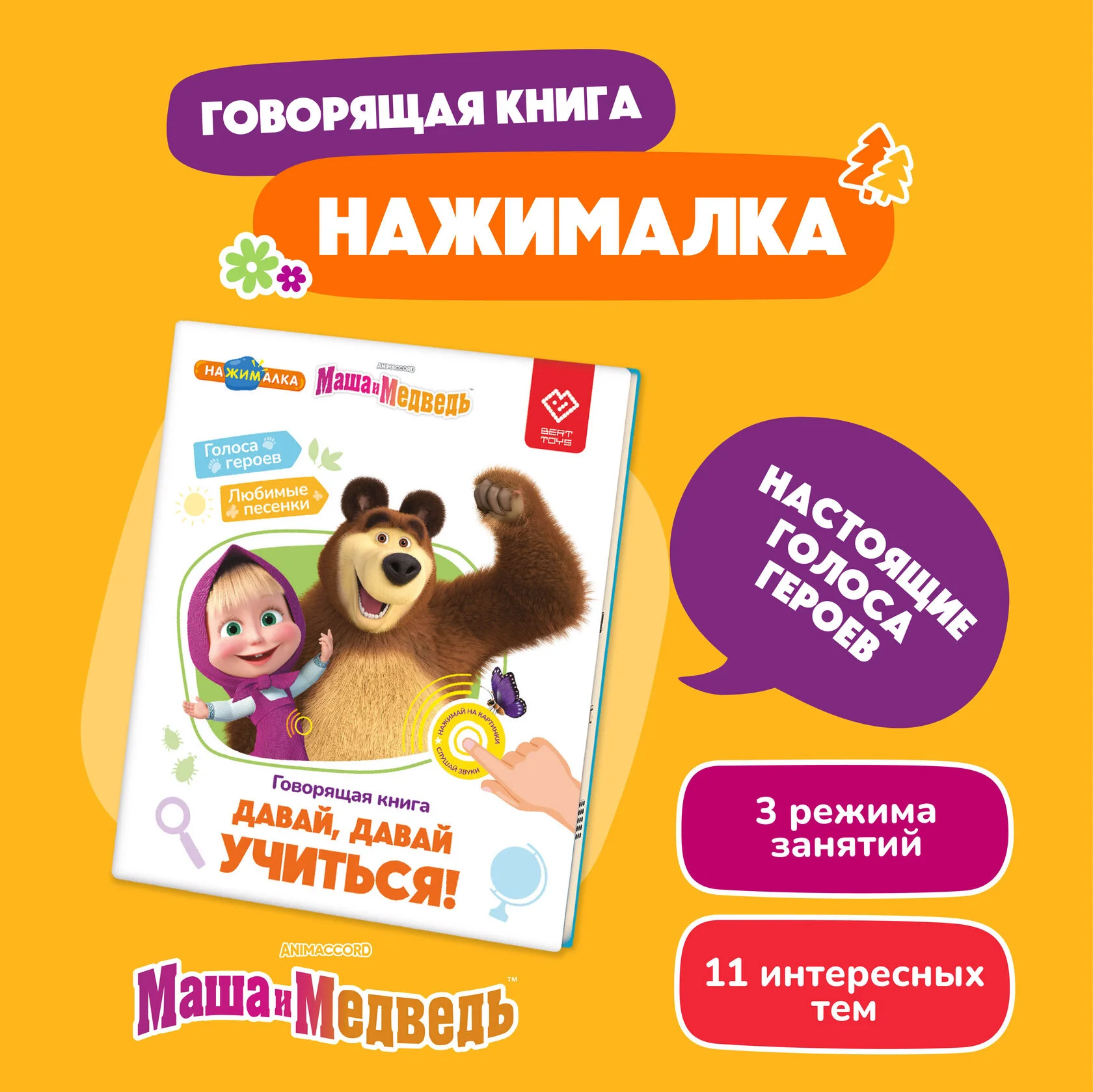 Говорящая интерактивная книжка Нажималка - Маша и Медведь. Давай, давай учиться!, BertToys FD149