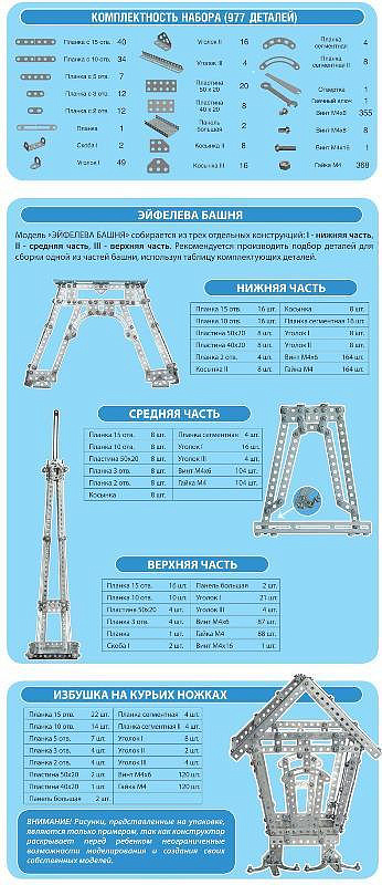 Этот железный конструктор является одним из наиболее больших и габаритных металлических конструкторов. И "детским" этот набор можно назвать достаточно условно, с некоторыми оговорками. Первоначально металлический конструктор "Эйфелева башня" состоял из 893-х деталей, затем имел в своем составе 909 деталей и, наконец, в сегодняшнем исполнении, имеет 977 деталей. В новом виде этот конструктор избавлен от длинных, неудобных и недостаточно прочных, по отзывам покупателей, деталей. Совершенно другой стала и схема сборки, сейчас она цветная и более подробная. Как и изначально, так и сейчас, конструктор позволяет собрать или "просто избушку" или макет Эйфелевой башни высотой 78 сантиметров. Советуем начинать с избушки, потому, что собирать и разбирать ее меньше по времени, а самое главное, разбирать не так жалко. Ведь спорным остается только 100% сходство нашей Эйфелевой башни с оригиналом, узнаваемость присутствует точно, и уже не одну детскую украшает наша металлическая конструкция как память о "трудовом подвиге".