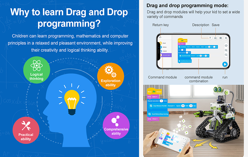Управляйте роботом пультом управления или созданием своей собственной последовательностью команд с помощью смарфона и управления перетаскиванием.