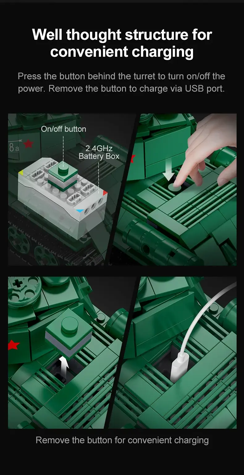 Танк Т34 на радиоуправлении конструктор Cada Technic C61072 Модель легендарного совецкого танка Второй мировой войны очень реалистичный. Зелёный цвет корпуса, топливные баки и выхлопные трубы в задней части кузова, бронированные шторки над гусеницами, люки механиков и командира, пулемет и прожекторы в носовой части боевой машины. Электромоторы обеспечивают движение гусениц и разворот танка на месте, а так же вращение башни на 360 градусов в обе стороны.