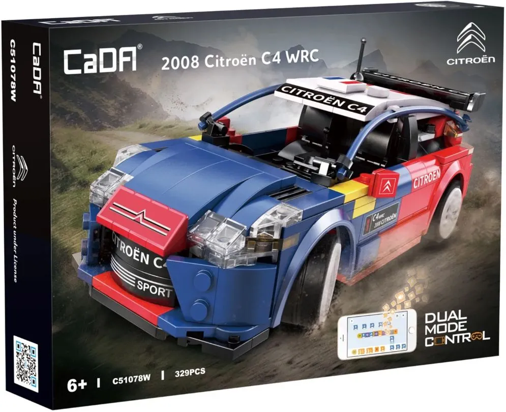 Радиоуправляемый конструктор от CADA представляет собой набор для постройки раллийного автомобиля Citroën C4WRC из 329 деталей в масштабе 1/20. Модель детально проработана - на корпусе присутствуют все надписи и обозначения реального прототипа, спойлер, запасное колесо и зеркала заднего вида. Управлять машинкой можно как при помощи пульта управления, так и приложения на телефоне.