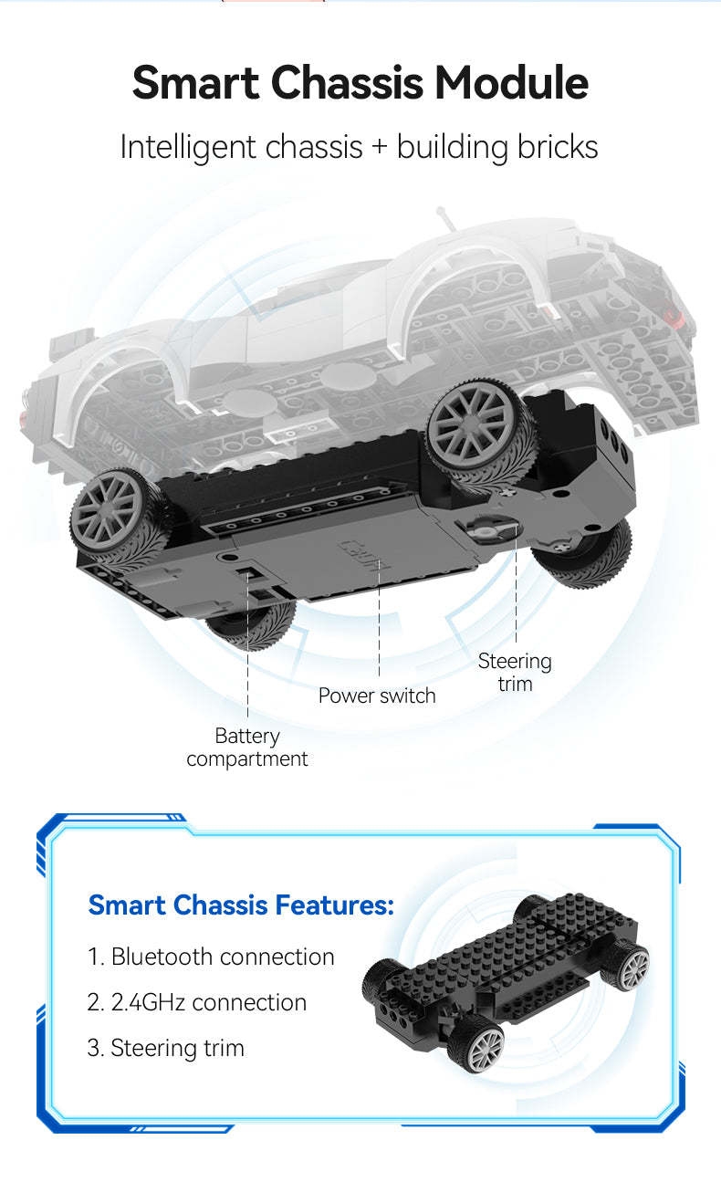 Можно управлять со смартфона через Bluetooth либо с пульта 2.4G. Питание машинки: 3хАА. Питание пульта: 2хААА. Размер: 19.8х8.9х5.8 см. Дальность управления: 25 м. Скорость: 3.6 км/ч. Масштаб: 1:20