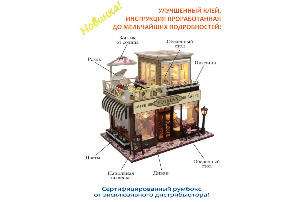 Румбокс - это готовый интерьерный конструктор (инструкция на русском языке!) для творчества от официального дистрибьютера HOBBY DAY. Внутри набора Вы найдете все необходимое, чтобы воссоздать своими руками одно из самых известных кафе в мире. Для Вашего удобства разработана новая пошаговая иллюстрированная инструкция на русском языке, проработанная до мельчайших подробностей. Во всех наборах новый усиленный клей без запаха. Светодиодная LED-подсветка. Все детали выполнены из безопасных материалов и необыкновенно реалистичны.