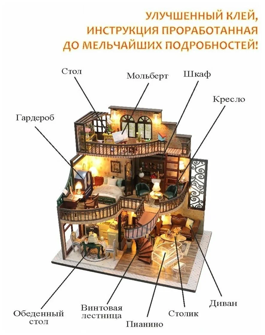 Румбокс "Дом в английском стиле" (M2132) — это уникальный конструктор, который поможет создать уютную атмосферу английского загородного трехэтажного особняка в небольшом пространстве. В набор этого интерьерного конструктора включены все необходимые материалы из пластика, картона, текстиля, бумаги и фанеры, а также подробная инструкция по сборке.