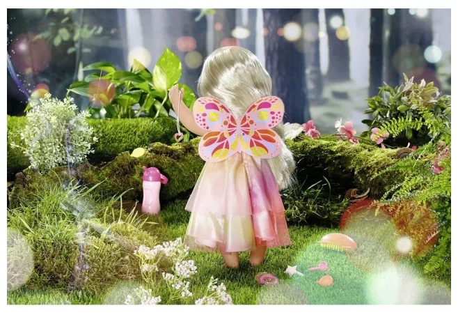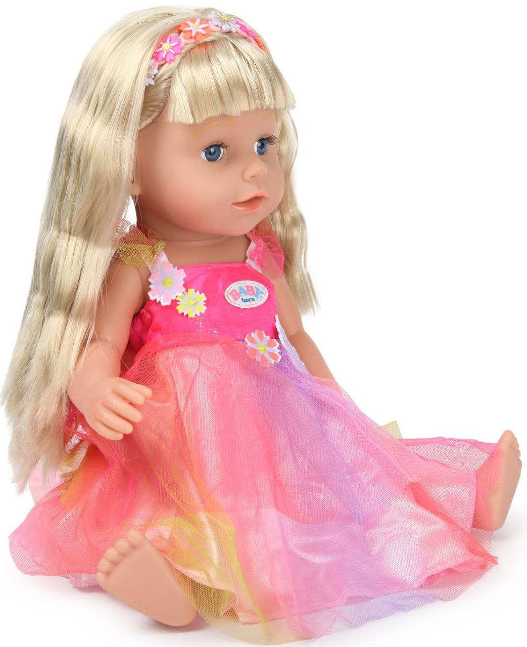 Интерактивная куколка Бэби Борн с красивыми глазками, пухлыми щечками и губками. Длинные светлые волосы с челкой, которые можно расчесывать и делать с ними разные прически. В наборе есть 2 цветные пряди, которые можно использовать при создании креативной прически. Куколка одета в платье единорога с крылышками, а на голове у нее ободок. Высота куколки 43 см. Куколка умеет стоять, у нее подвижные руки и ноги, сгибающиеся колени. Умеет плакать настоящими слезами.
