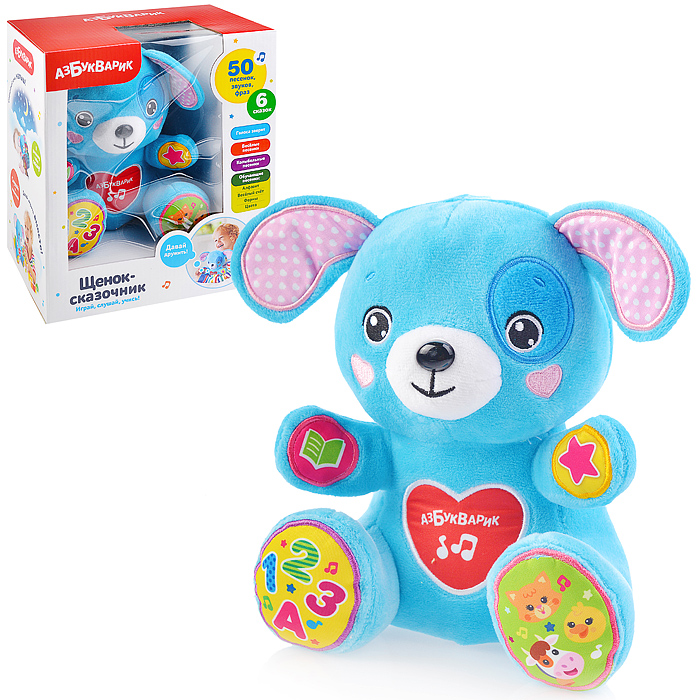 Роль рассказчика сказок в семье легко заменит этот музыкальный щенок от Азбукварик, он не только будет помогать малышу уложиться спать, но и весело с ним поиграет днем, помогая запомнить буквы счет и цвета.