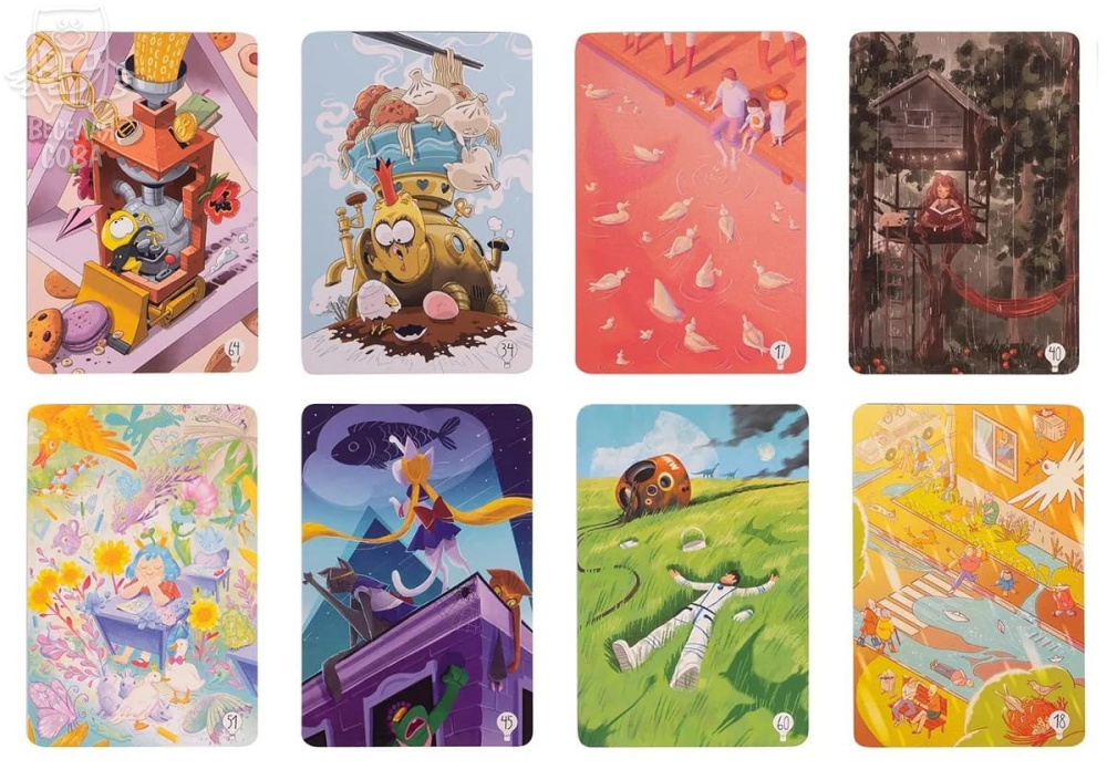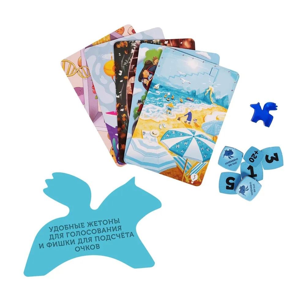 Каждый игрок получает карточки с рисунками. Ведущий (его роль передаётся всем по кругу) придумывает и озвучивает ассоциацию к любой иллюстрации на руках. А участники в свою очередь ищут среди своего набора подходящую по описанию карту. После этого все карты, обязательно в закрытую, выкладываются на стол. Вы должны найти среди них карту ведущего и проголосовать за неё. Угадавшие игроки получают победные очки.Ведущему нужно быть внимательным: его карту должно угадать большинство игроков, но не все.