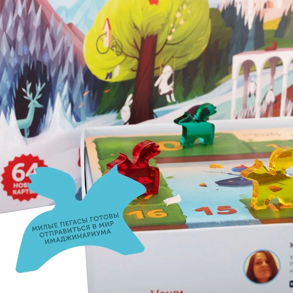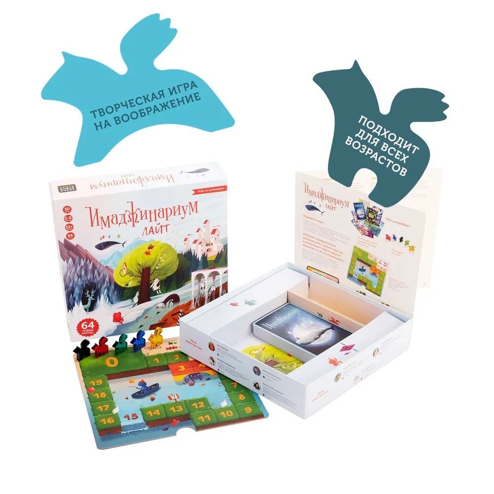 В набор вошли 64 уникальные иллюстрации от наших художников. Других таких же забавных, немного пугающих и заставляющих задуматься, карточек вы не встретите. Просто взгляните на них, и у вас появится миллион ассоциаций! Пять волшебных пегасов станут вашими фишками игроков и проведут по фантастическому миру Имаджинариума.Если вы ещё не пробовали «Имаджинариум», то «Лайт» станет отличным началом погружения в мир фантазии! А если играли, то он прекрасно впишется в вашу коллекцию, дополняя базовые или сумчатые версии. Этот облегченный формат «Имаджинариума» идеален для встреч с друзьями, посиделок с семьёй и вечеров с коллегами. А ещё его удобно брать в гости — небольшая коробочка легко помещается в рюкзак или сумку.