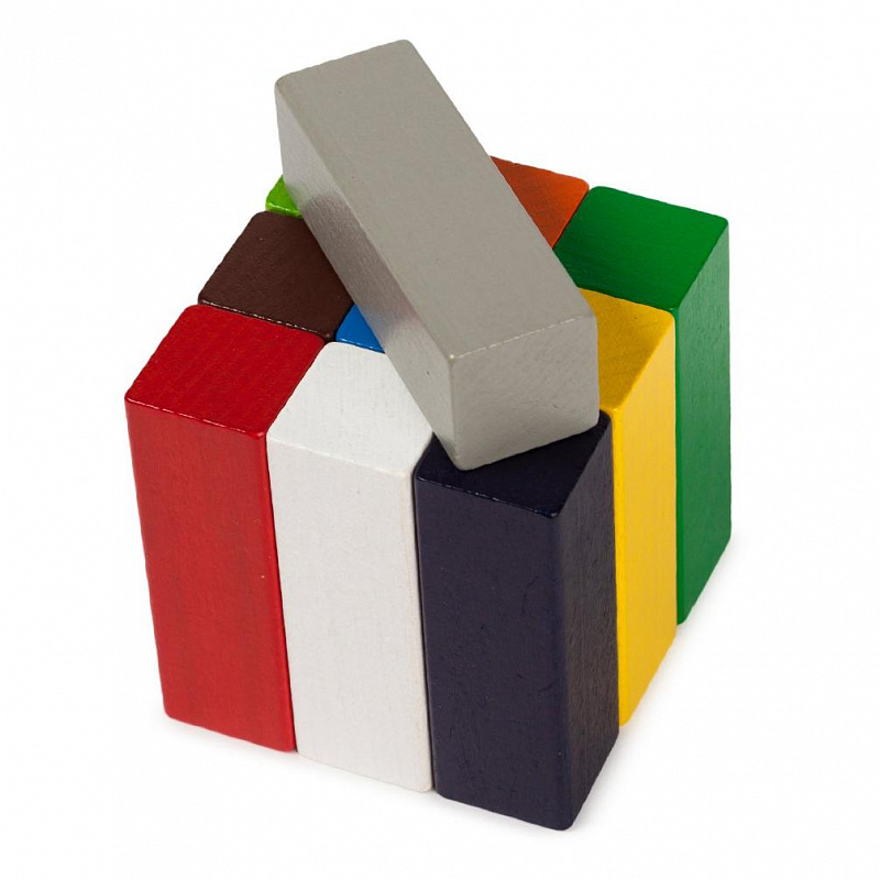 таймер, 10 деревянных строительных элементов, 60 карточек-схем, кубик. |