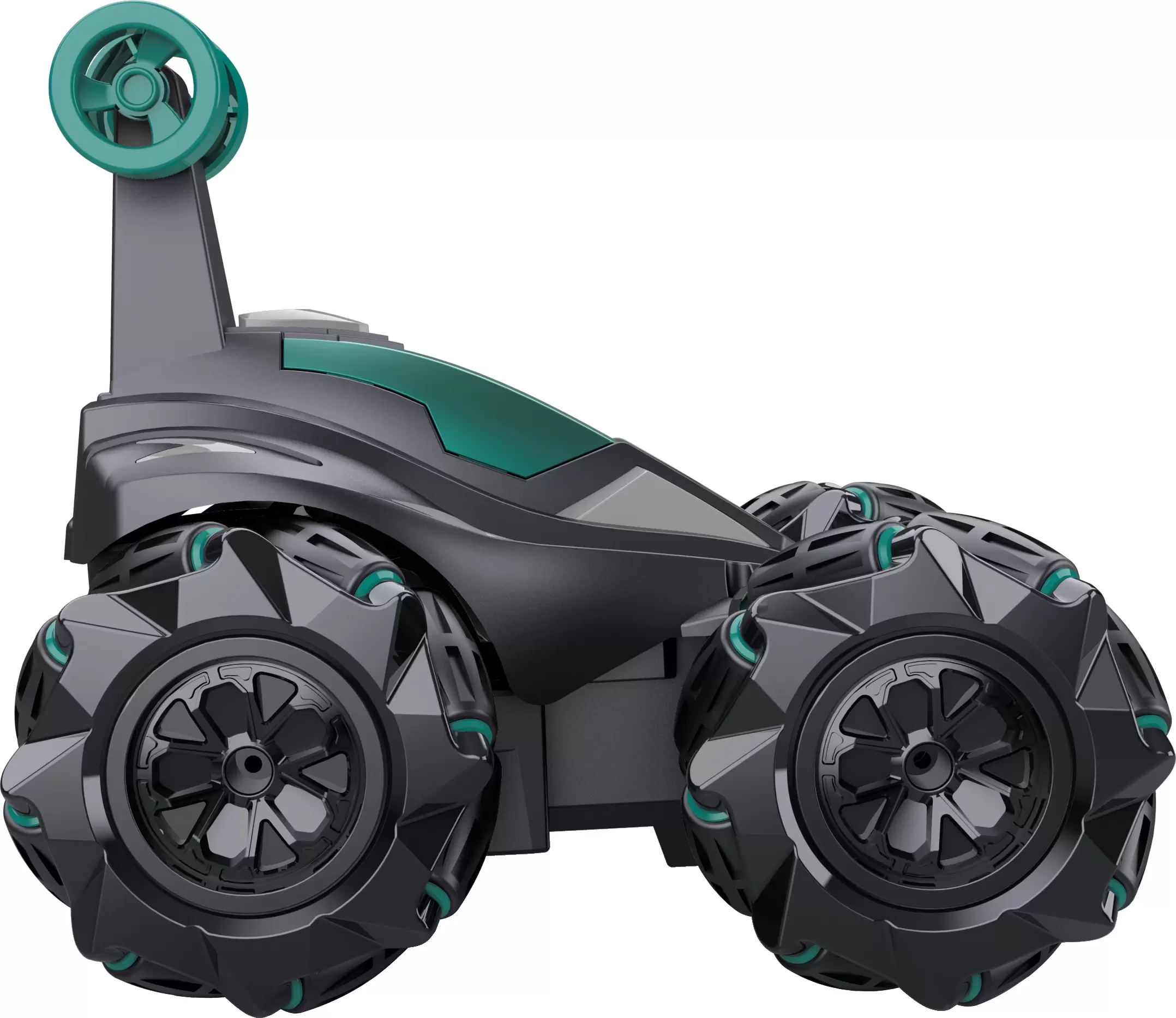 преодолевать различные препятствия, переворачиваться и продолжать движение в вертикальном положении, опираясь на задние вспомогательные колеса, а также вращаться на 360°. Дополнена подсветкой и звуковыми эффектами. Пульт работает