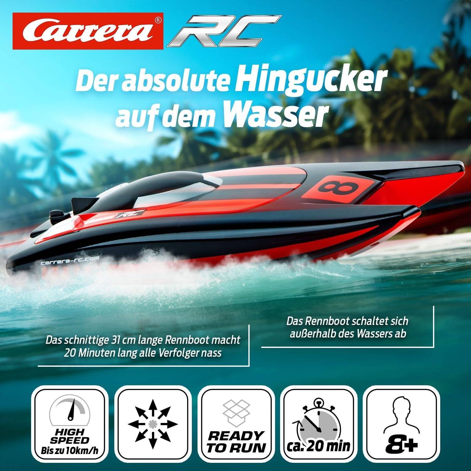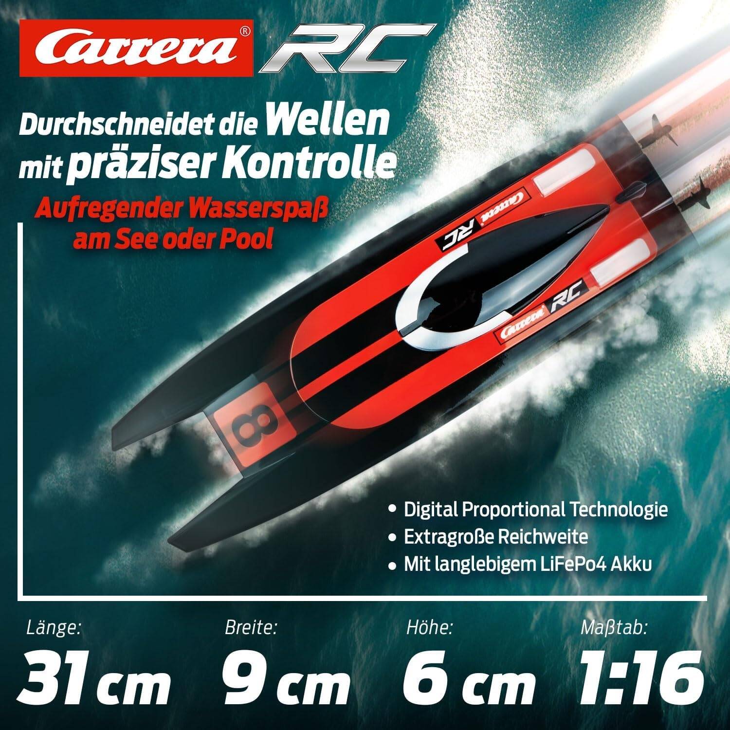 Выполненный в агрессивном чёрно-красном гоночном стиле, этот RC Boat мгновенно привлекает внимание. Корпус типа катамаран обеспечивает превосходную устойчивость на воде, позволяя катеру на пульте управления уверенно рассекать волны на высокой скорости. Carrera Race Catamaran развивает скорость до 10 км/ч . Представьте азарт гонки, когда ваш корабль обходит соперников и оставляет за собой шлейф брызг!