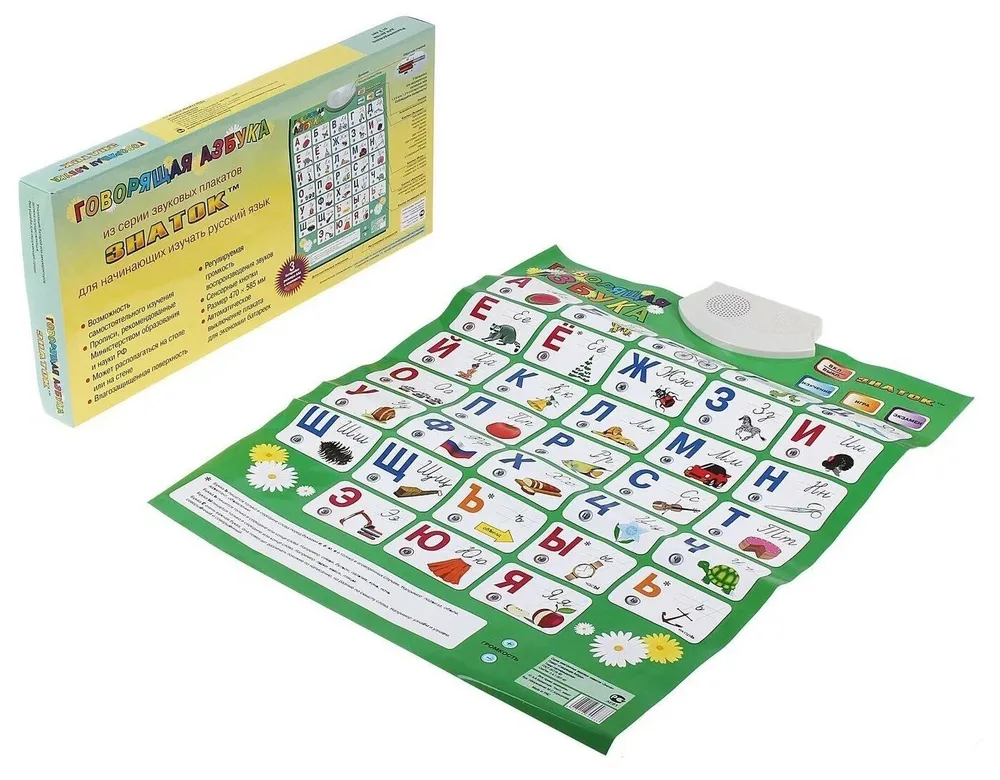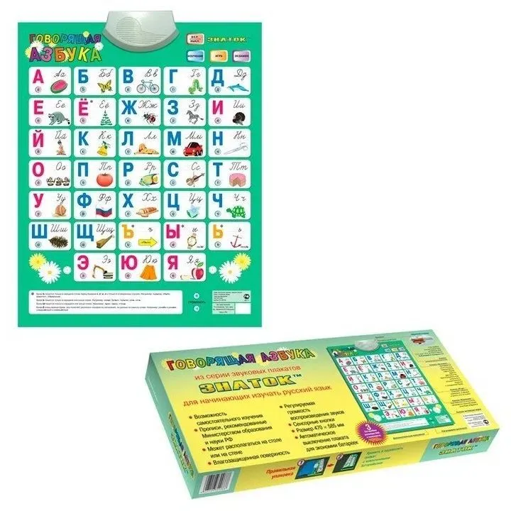 Новая версия популярнейшего звукового плаката «Говорящая Азбука» предназначен для детей и взрослых, начинающих изучать русский язык. Дополнения в плакат были внесены в соответствии с пожеланиями родителей и педагогов. В процессе пользования плакатом можно познакомиться не только с «именем» буквы, но и её звуком и порядковым номером, услышать стихи и весёлую песенку про алфавит. Имеет 8 режимов работы.