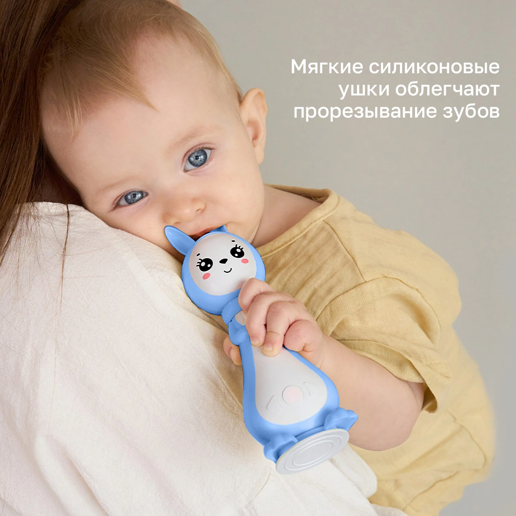 Игрушка оснащена прочными силиконовыми ушками-грызунками, которые успокаивают десны и помогают уменьшить боль при прорезывании зубов. Материал из силикона безопасен для здоровья и не вызывает аллергии. Корпус зайчика выполнен из прочного противоударного ABS-пластика, который выдерживает нагрузку до 8 кг. Удобные увеличенные кнопки позволяют ребенку легко переключать режимы игры.