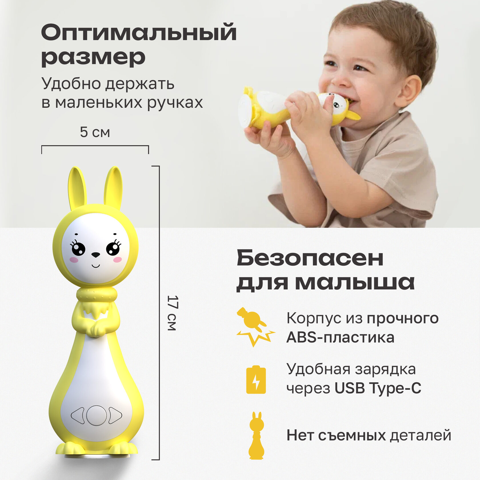 Игрушка изготовлена из высококачественного ABS-пластика и гипоаллергенного силикона. Прочные силиконовые ушки выдерживают нагрузку до 8 кг, выполняя роль удобного прорезывателя для зубов.