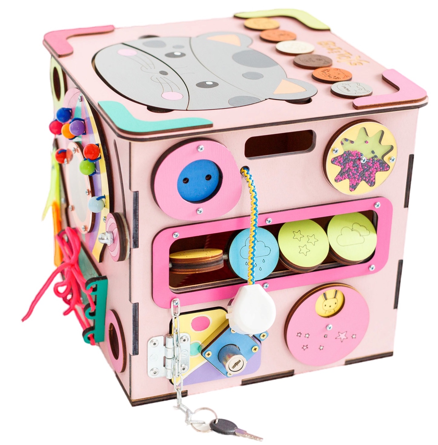 Уникальный и очень красивый бизибокс! На крыше такого бизикуба находятся животные, которые необходимо собирать из 3-ех частей. Сравнительно небольшие размеры бизибокса вмещают в себе элементы на развитие мелкой моторики, усидчивости, логическое мышление, координацию движений.