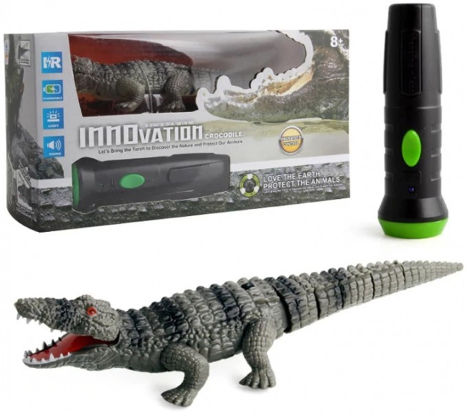 - Обратите внимание на форму пульта дистанционного управления – это зеленый фонарик с функцией включения подсветки и регулированием движений крокодила. Отправьте рептилию в темную комнату, а потом легко обнаружьте ее с помощью яркого «прожектора».
