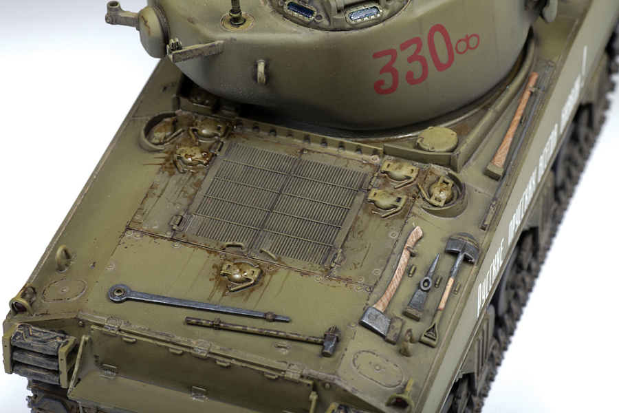 Боевое применение «Шерманов» показало, что при попадании бронебойных снарядов в борта корпуса танк склонен к возгоранию пороховых зарядов боеприпасов. С середины 1944 года танк получил новую конструкцию боеукладок, которые были перенесены на пол боевого отделения, в промежутки между гнёздами снарядов заливалась вода, смешанная с антифризом и ингибитором коррозии. Такие танки получили в обозначении индекс «(W)», и внешне отличались от более ранних вариантов отсутствием дополнительных бортовых бронеплит.
