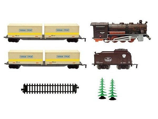 Комплект: паровоз, тендер, 2 контейнерных платформы, деревья, элементы пути.