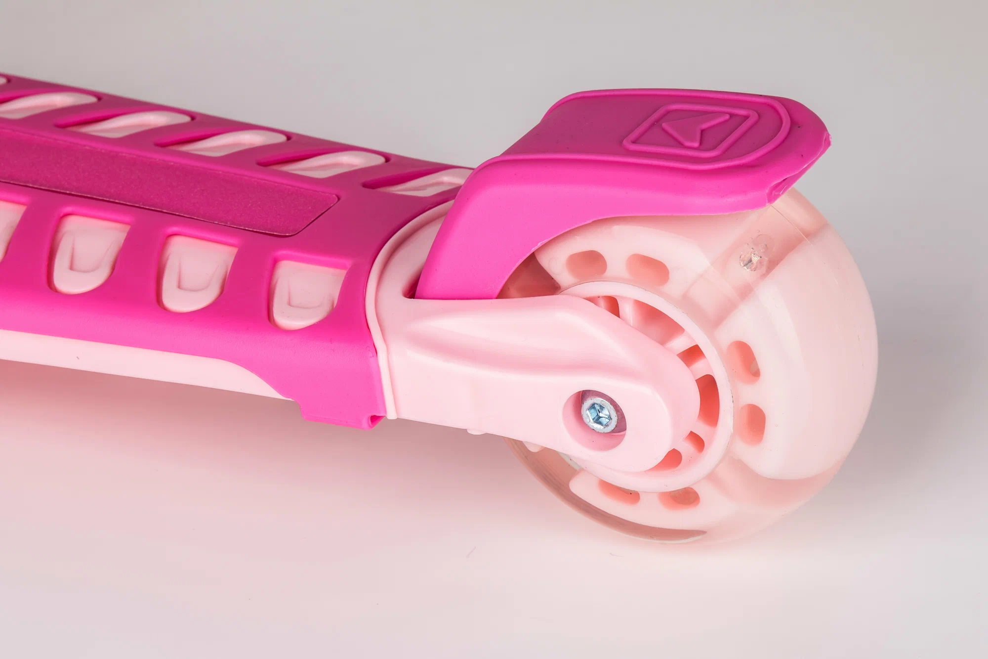 Модели 2020 года мы оснастили более широкими колесами (передние 120х40 мм и 100х45 мм заднее) со специальным полиуретановым покрытием - такие колеса дают лучшую амортизацию и проходимость при сохранении наката, особенно это чувствуется на тротуарной плитке. Подшипники вместо используемых в ранних моделях стандарта ABEC5 заменены на ABEC9. Заднее колесо оснащено крылом-тормозом. Все колеса самоката имеют так любимую детьми светодиодную подсветку, которая работает при движении.