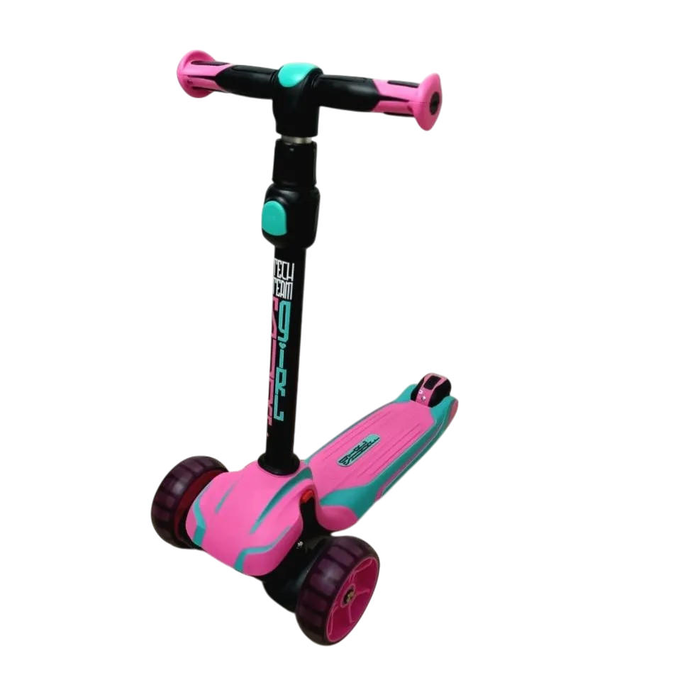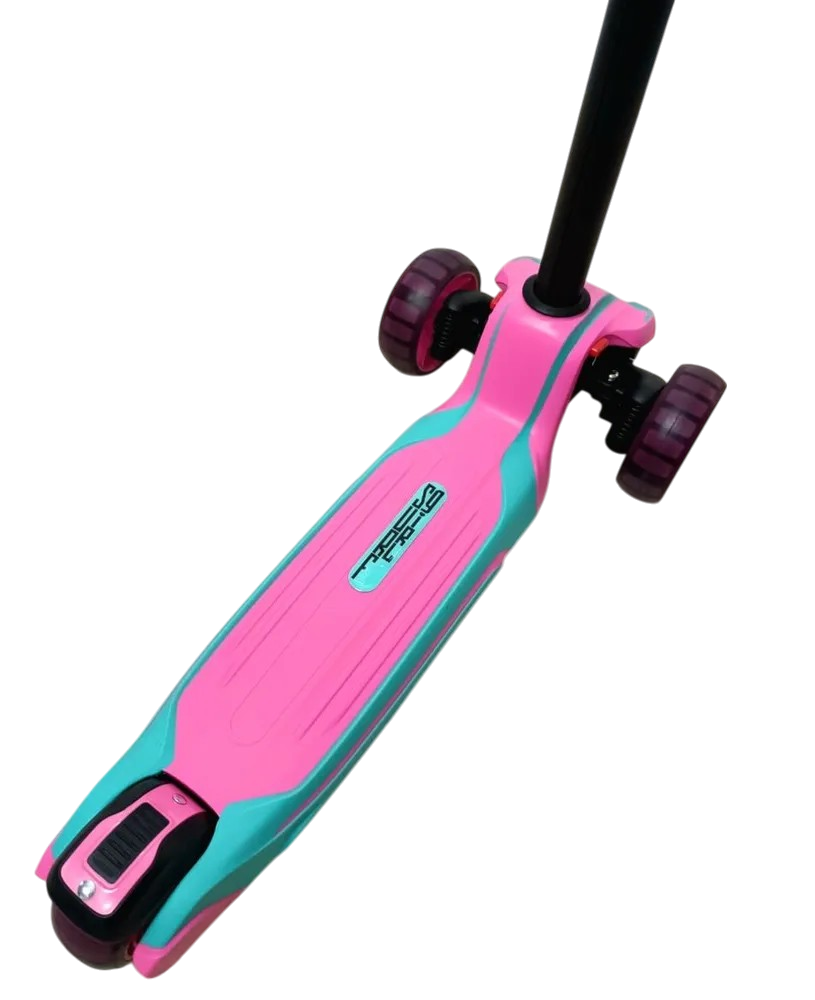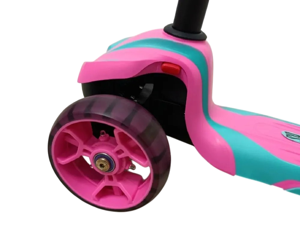 Колеса самоката широкие, выполнены из прочной пластмассы со специальным полиуретановым покрытием, обеспечивающим в совокупности с подшипниками стандарта ABEC 9, хорошие накат и амортизацию. Размер передних колес 120х40 мм, заднего - 80х50 мм. Заднее колесо оснащено крылом-тормозом. Все колеса самоката имеют так любимую детьми светодиодную подсветку, которая запускается при движении. Особенность подсветки в том, что благодаря применению прозрачного полиуретана в конструкции колес ребенок хорошо видит свечение.